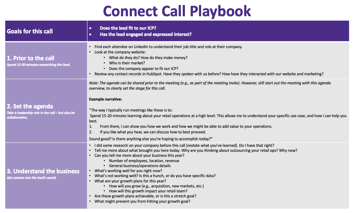 To make sure everyone on their sales team understood how to talk about their company, we started the playbook by spelling out the company’s ideal customer profile, target buyer personas, and approved brand messaging.