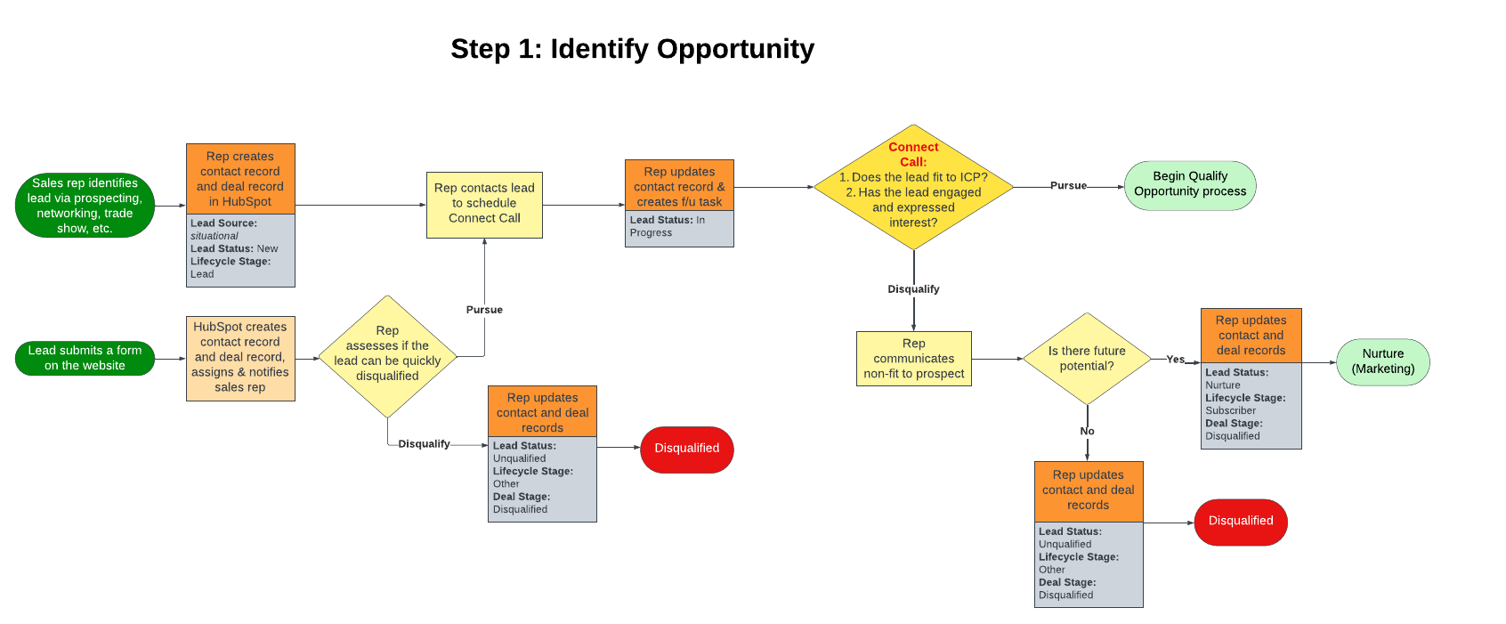 For example, as you can see in the chart below for the Identify Opportunity stage, orange boxes indicated when in the process the rep needs to update a HubSpot record, with explicit instructions on exactly what to do.